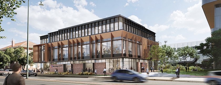 The new Bendigo City Campus features a prominent, easy to find front door for the campus, on Hargreaves Street. Here you’ll find an inviting Learning Hub, a one-stop-shop for learning and student support, with collaborative spaces for informal and formal training.